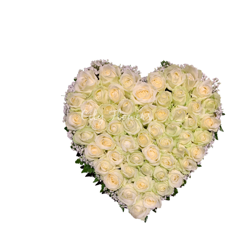 Mourning flowers in the shape of a heart made of white roses. Take a loved one to the last journey with sophistication.